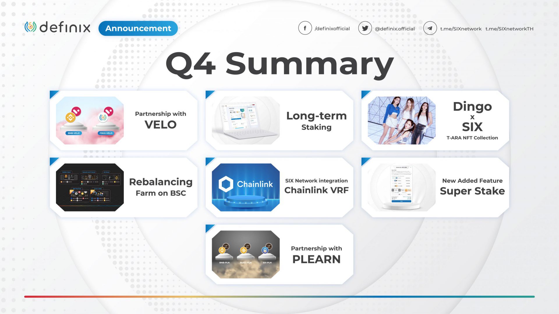 저희는 디피닉스라는 플랫폼의 발전을 원하는 홀더분들의 바램을 실현하기 위해 열정을 가지고 임하고 있습니다. 2021년도의 마지막 분기에, 저희 식스네트워크 팀은 진정한 탈중앙화 금융 프로토콜로 성장하고자 저희가 보유한 자원들을 최대한 활용하였습니다. 결론적으로 저희는 통찰력을 겸비한 프로토콜로 성장할 수 있었고, 이에 식스 및 디피닉스 커뮤니티 분들께 감사 인사를 드리고자 합니다.
